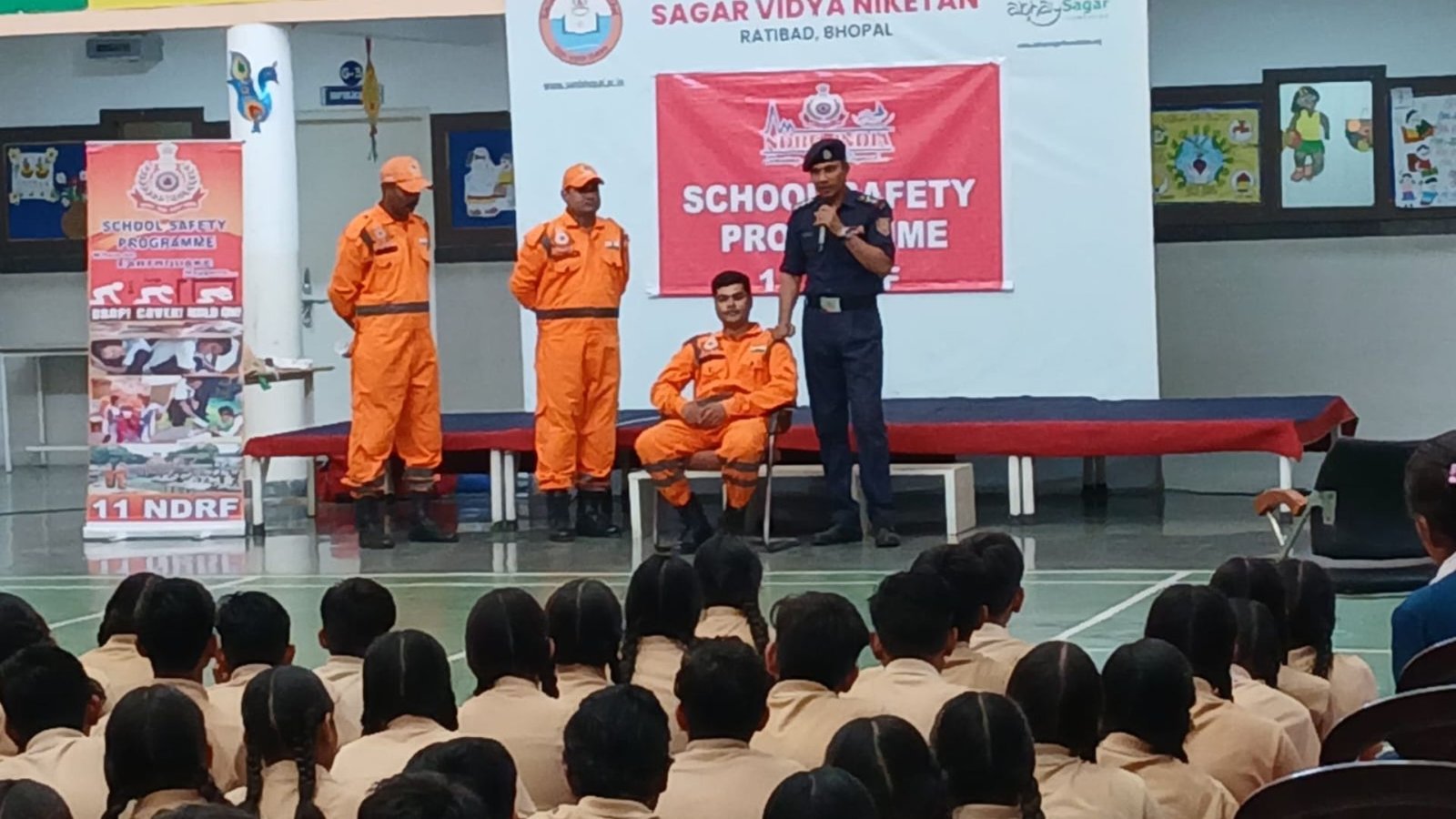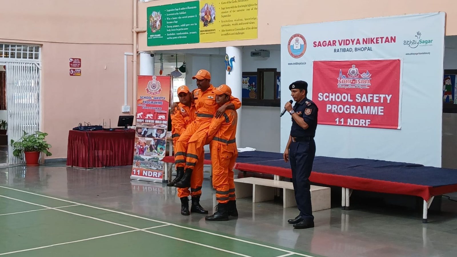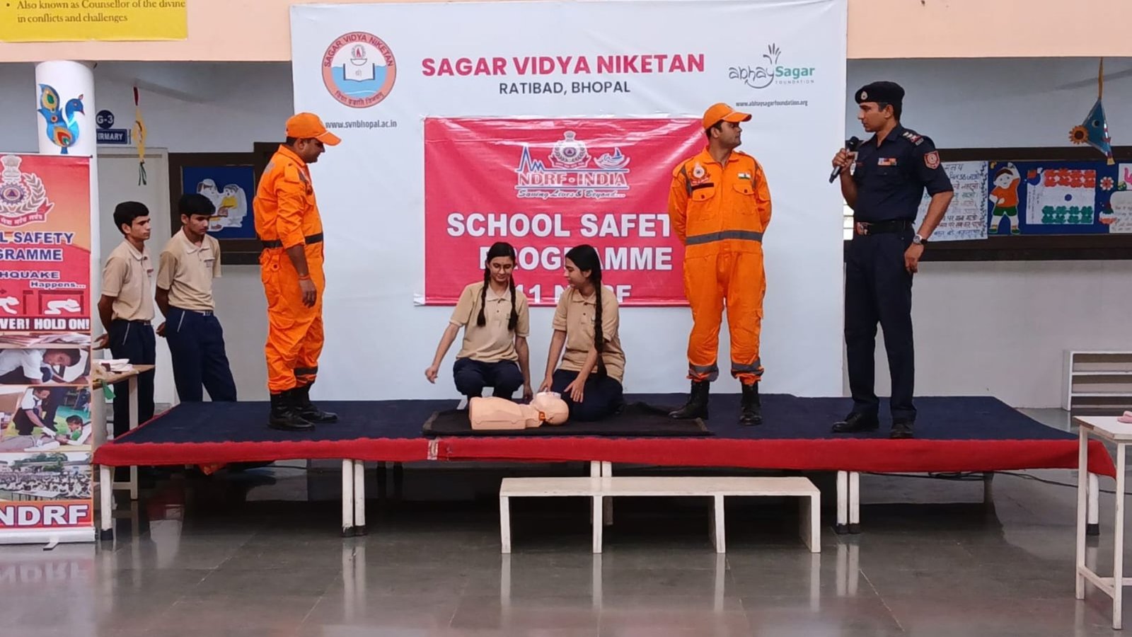 Preparedness is not about foreseeing disasters, but about empowering lives with the courage and skills to face them. On 18th September 2025, officials from the National Disaster Response Force (NDRF) conducted a Disaster Management and Safety Programme to train students in vital survival skills and emergency preparedness. The workshop began with demonstrations of life saving skills like CPR techniques, emphasizing the importance of quick action within the first 10 minutes of a cardiac emergency. Students also learned first aid measures such as treating open wounds with direct pressure and elevation, immobilizing arm and shoulder injuries, and checking vital signs effectively. To build disaster readiness, safety drills for earthquakes, fires, and floods were introduced. Students practiced protective measures like covering the head under a desk, the “Stop, Drop, and Roll” technique, recovery position for unconscious persons, and the correct use of life jackets. They were also shown how to prepare improvised stretchers for shifting injured individuals. The programme not only provided practical exposure but also instilled confidence, presence of mind, and responsibility among students to safeguard themselves and assist others during emergencies.